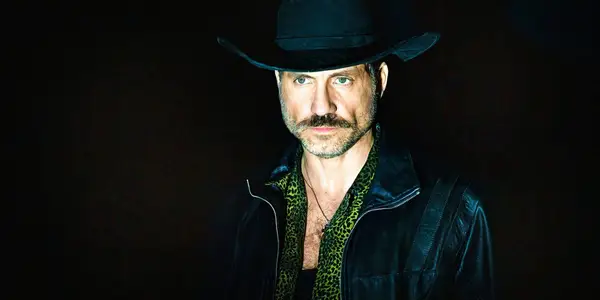Edgar Ramirez contra un fons negre que portava un barret de vaquer a Emilia Pérez