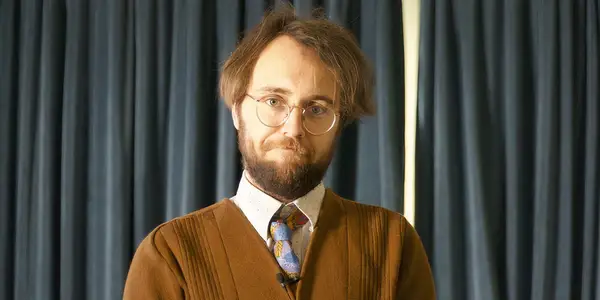 | Dougie Baldwin | Connor McAllister | Dougie Baldwin smiles blandly with messy hair in front of a curtain in Detention |