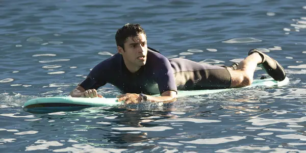 Sean Teale com Tristan en un tauler de surf a la temporada 1 del doctor Odyssey, episodi 9