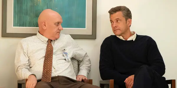 Mike O'Malley com a Rodney assegut amb Max Bankman de Joshua Jackson a l'episodi 15 del Doctor Odyssey.